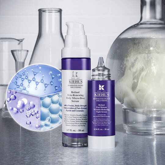 • Hierfür eignen sich die Retinol-Produkte von Kiehl's besonders gut, da sie besonders hautverträglich sind: Starte beispielsweise mit unserem Retinol Skin-Renewing Daily Micro-Dose Serum oder für die Nacht mit unserem Retinol Fast Release Wrinkle-Reducing Night Serum mit einer ebenso milden Formulierung einer niedrigen Konzentration von 0,3 % Retinol.